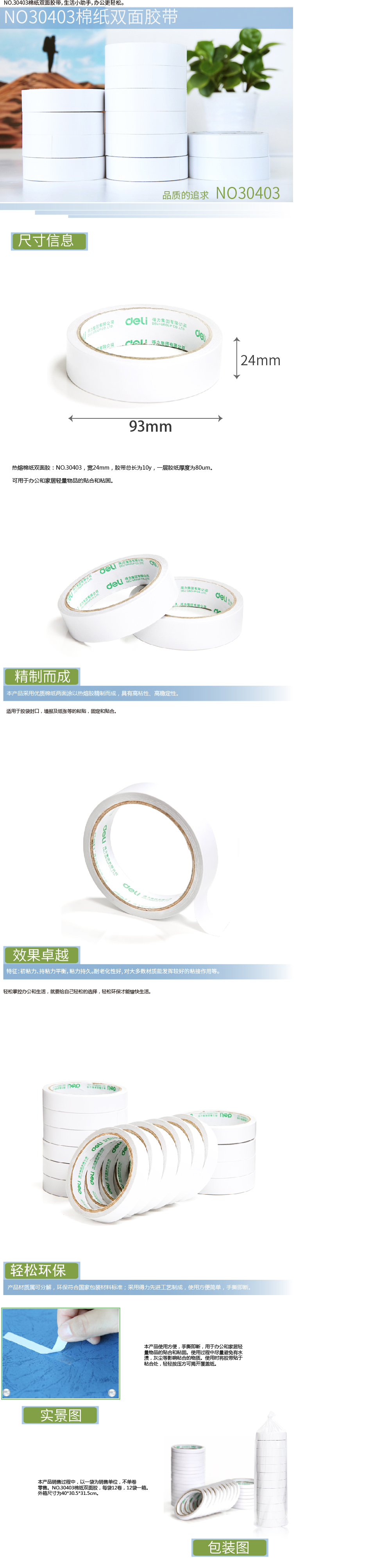 得力 30403棉纸双面胶带24mm*10y*80um(白)(12卷/袋) 自营