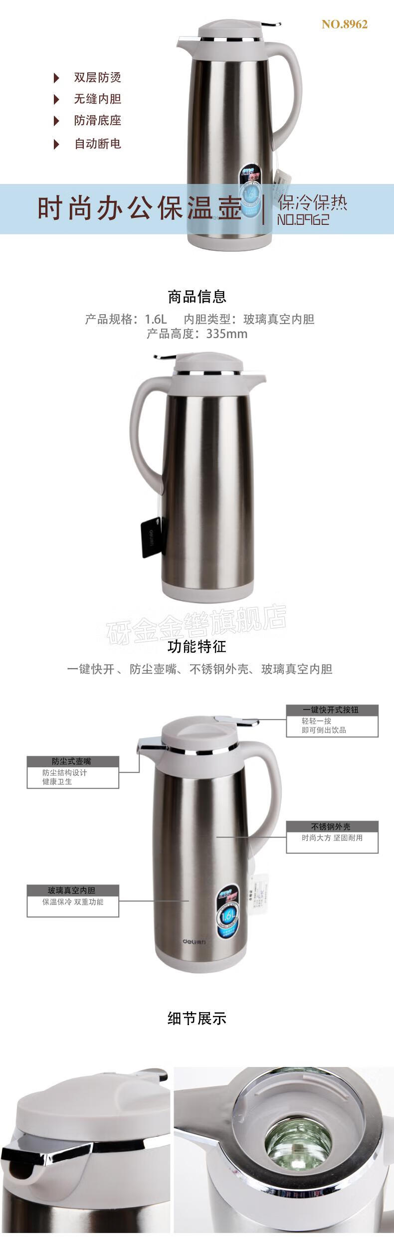 得力8961 得力8961不锈钢外壳真空玻璃内胆两用保冷保温壶15L导流壶嘴翘板 8961 本色1.5L 一个 31*19cm 自营
