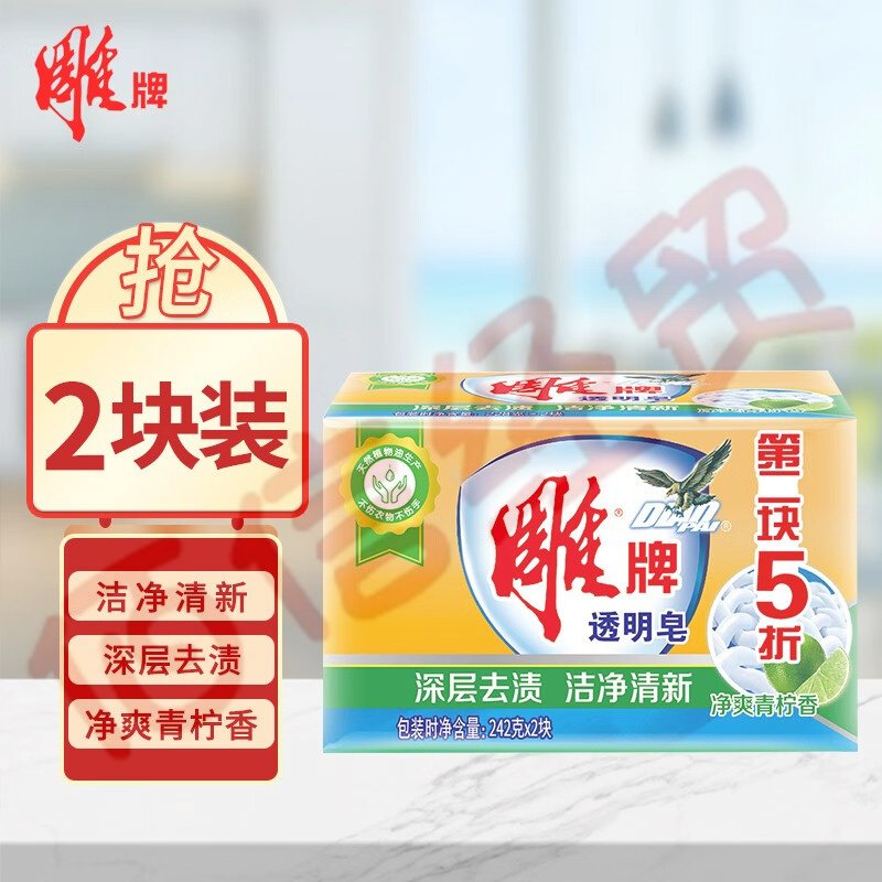 雕牌肥皂242g透明皂/洗衣皂深层去渍不伤衣物不伤手净爽青柠香去污渍家庭家用实惠装 【共两块】242g*1组 单组价格 每箱18块(整箱售)(相当于36块) 自营
