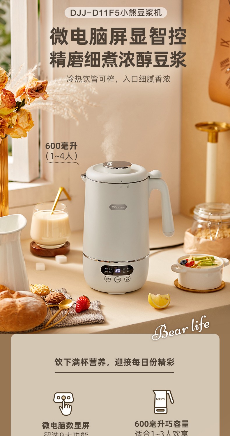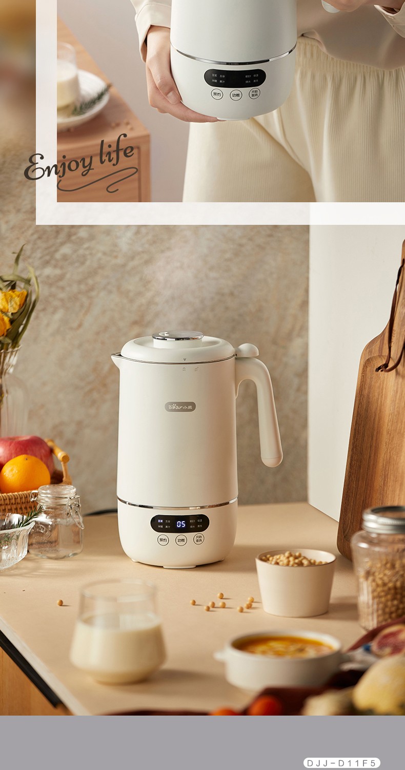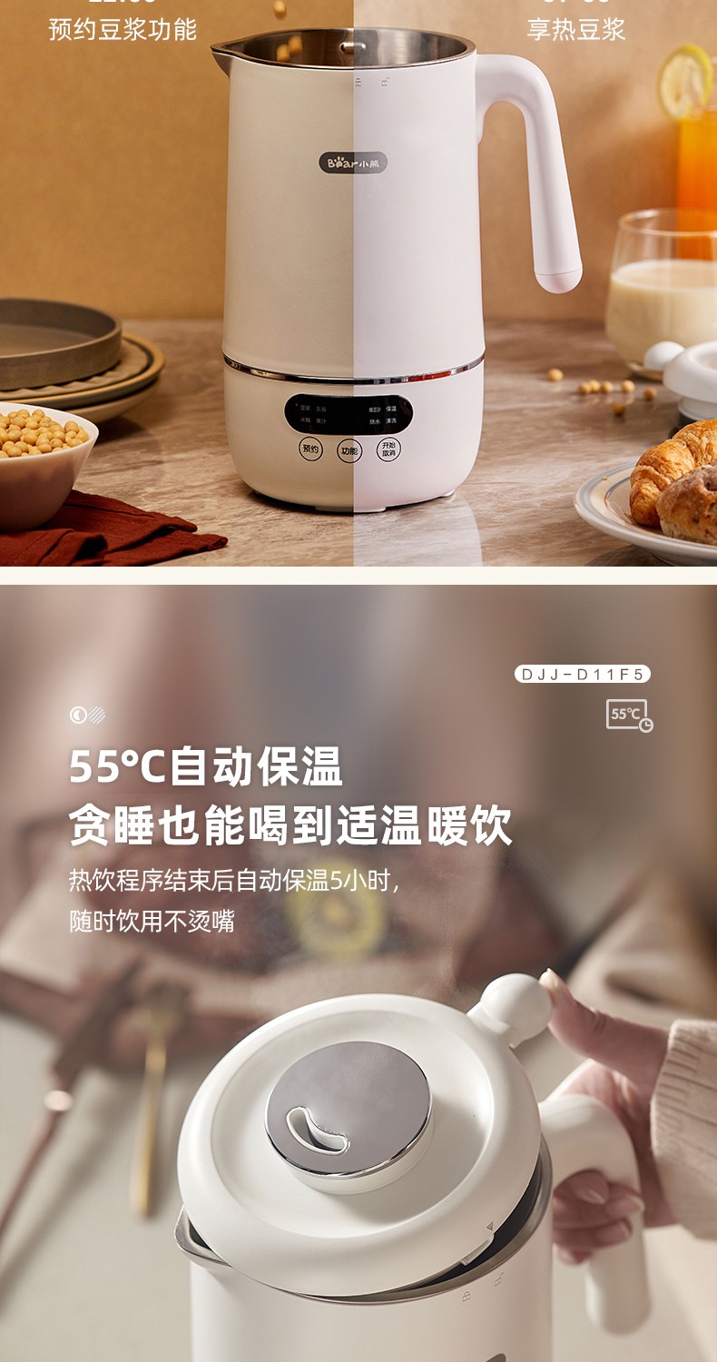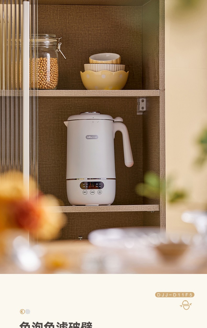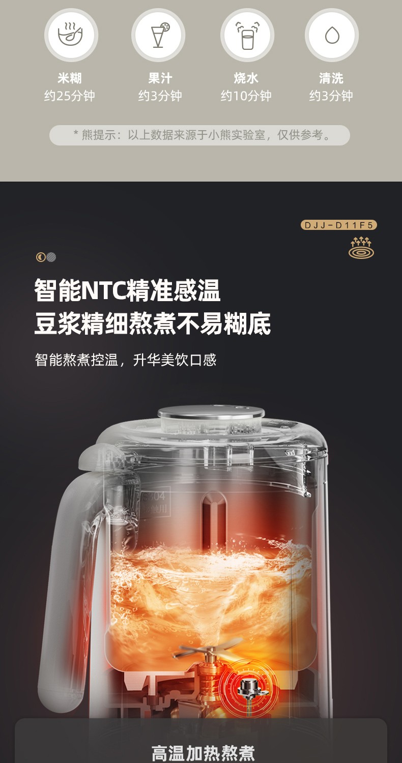小熊(Bear) 豆浆机家用破壁免泡免滤密闭熬煮智能预约304级不锈钢多功能DJJ-D11F5 微电脑触控丨精磨慢煮