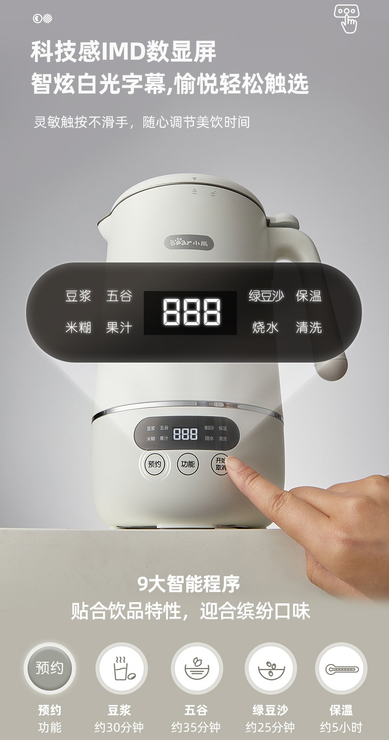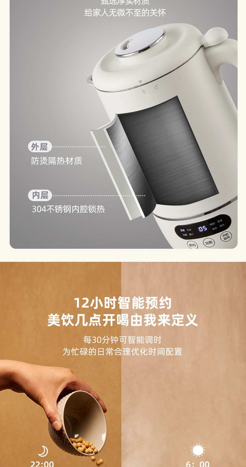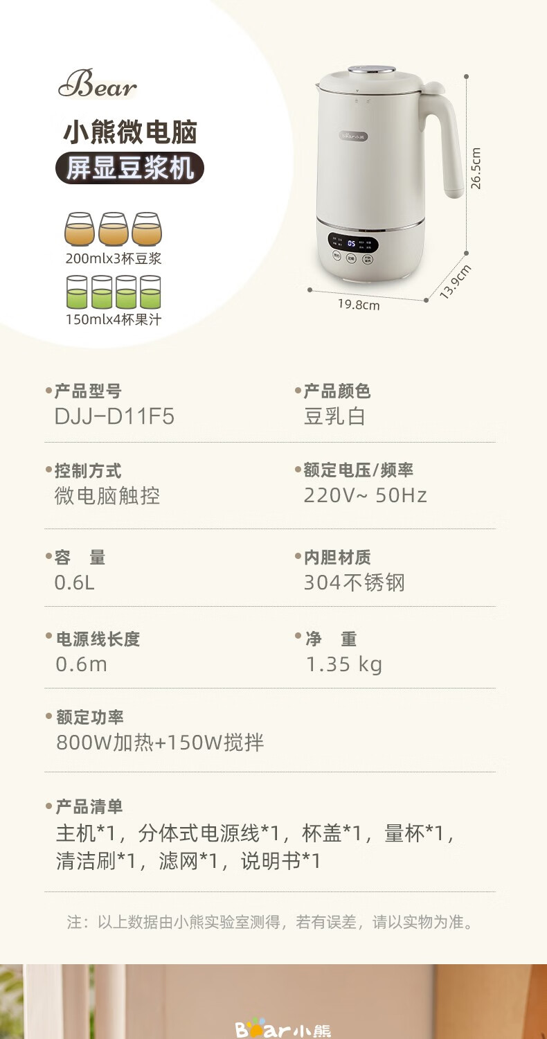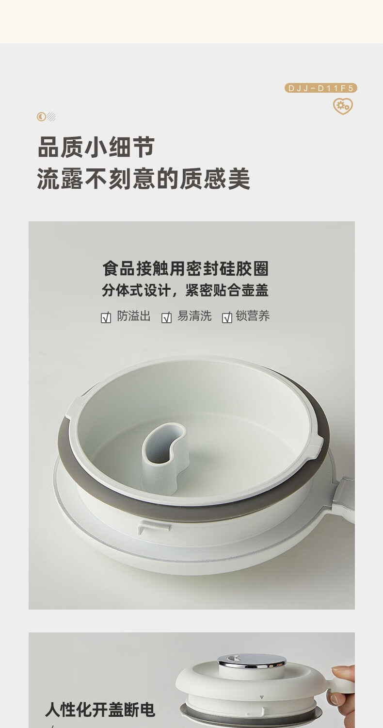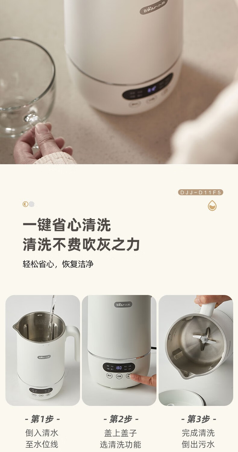 小熊(Bear) 豆浆机家用破壁免泡免滤密闭熬煮智能预约304级不锈钢多功能DJJ-D11F5 微电脑触控丨精磨慢煮