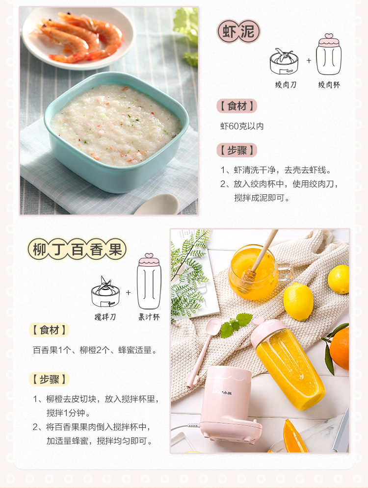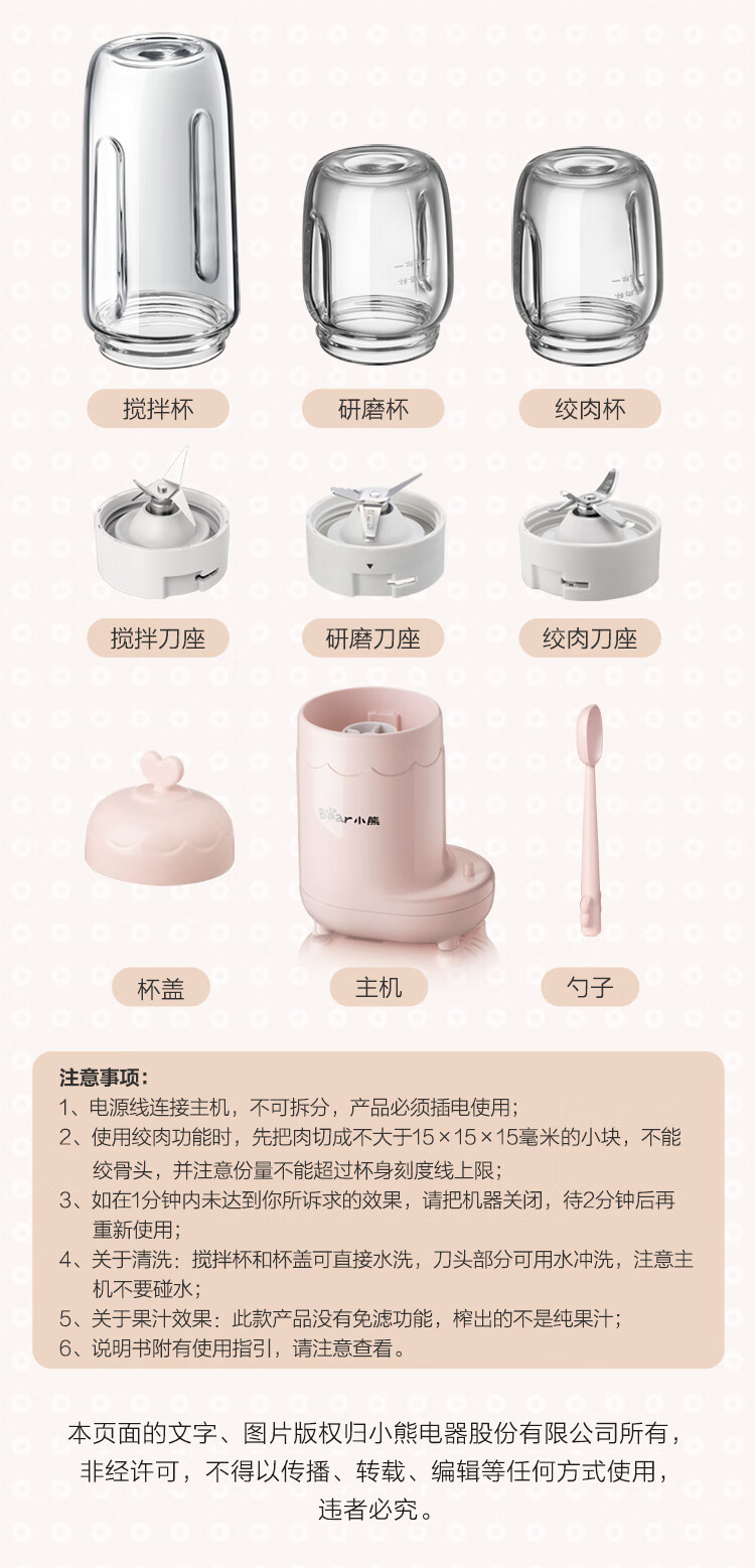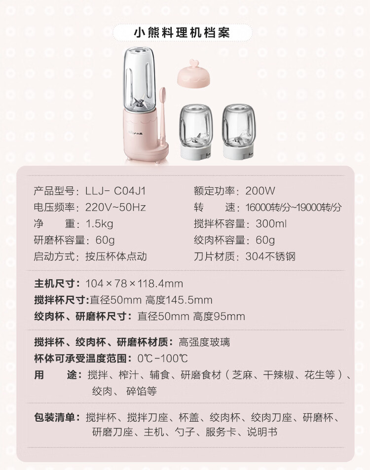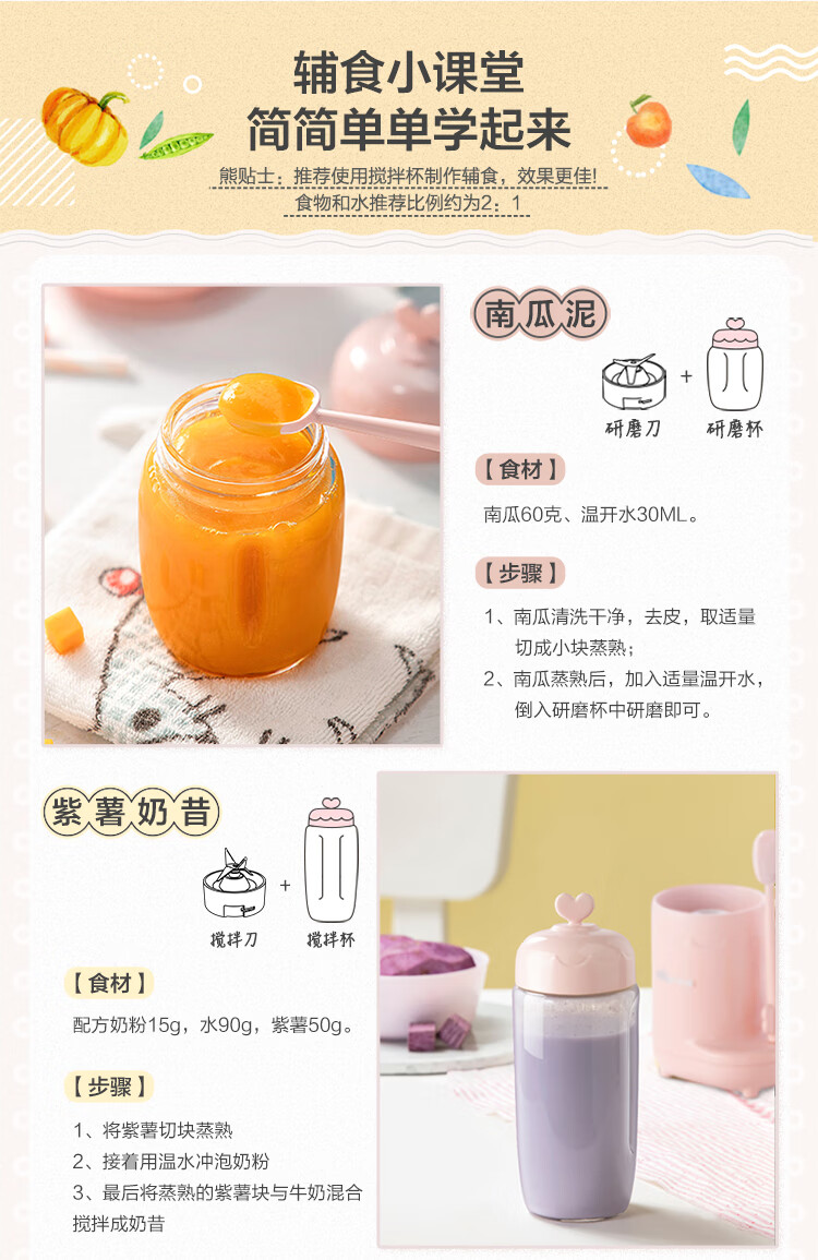 小熊(Bear)料理机婴儿辅食绞肉机家用多功能全自动小型迷你宝宝搅拌机料理棒米糊研磨器 三杯三刀 LLJ-C04J1 自营