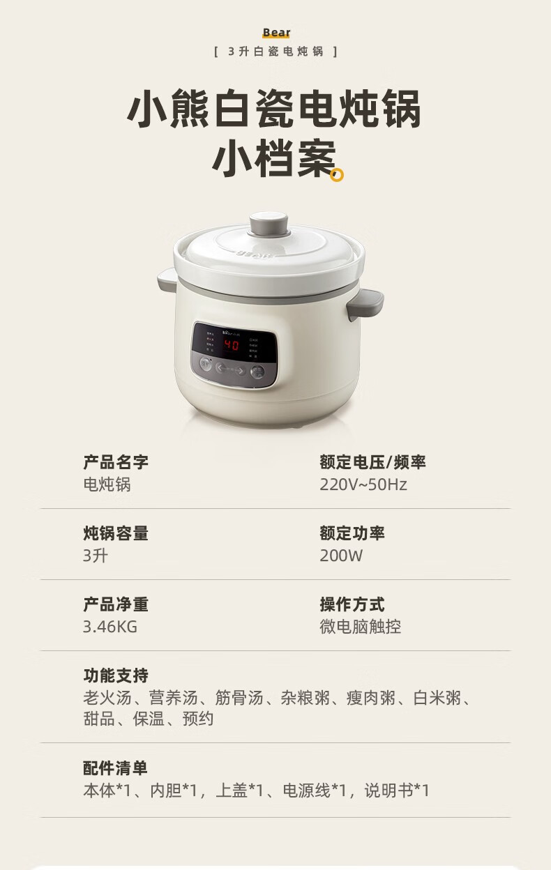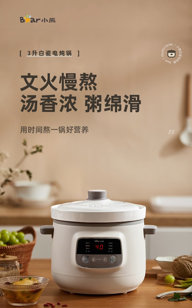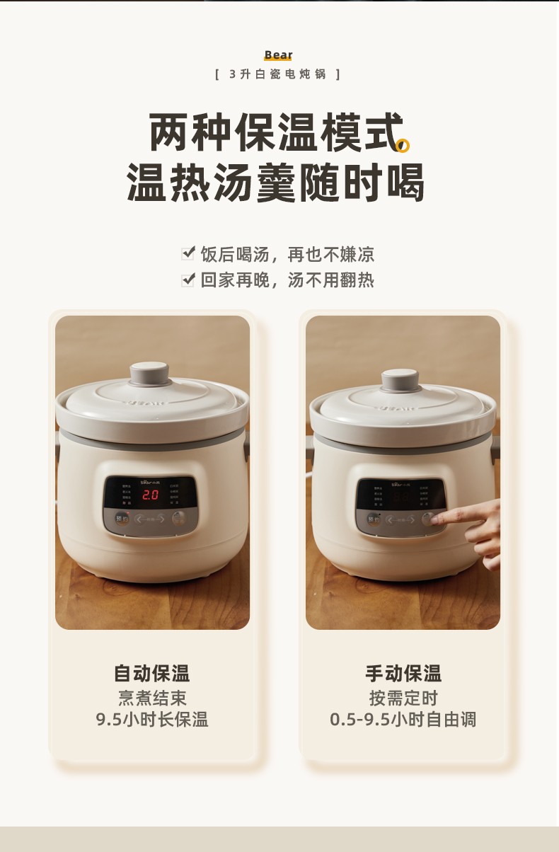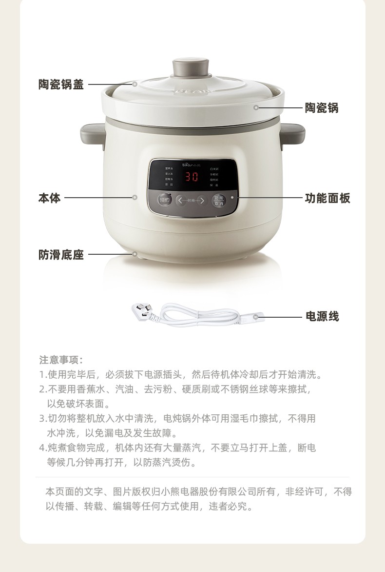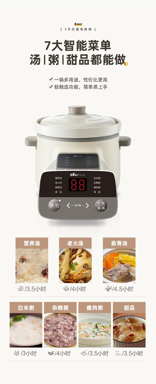 小熊(Bear) 电炖锅电炖盅煲汤锅燕窝炖盅炖汤锅煮粥锅BB煲 3L容量可预约多功能 白瓷内胆DDG-D30H5 自营