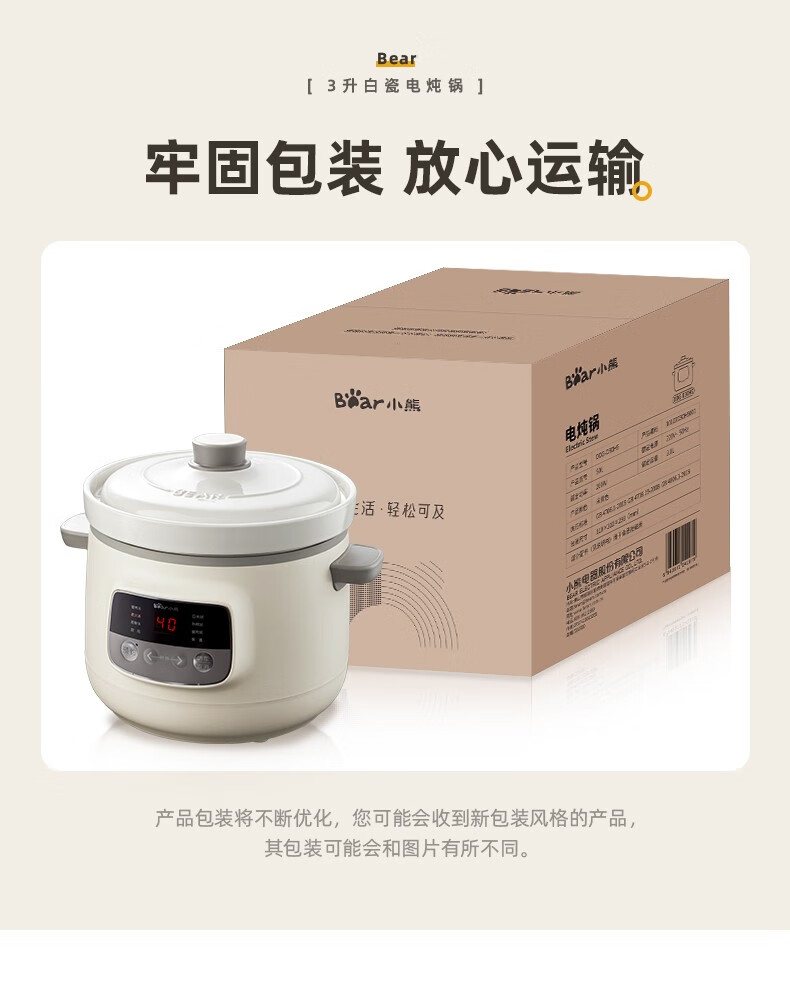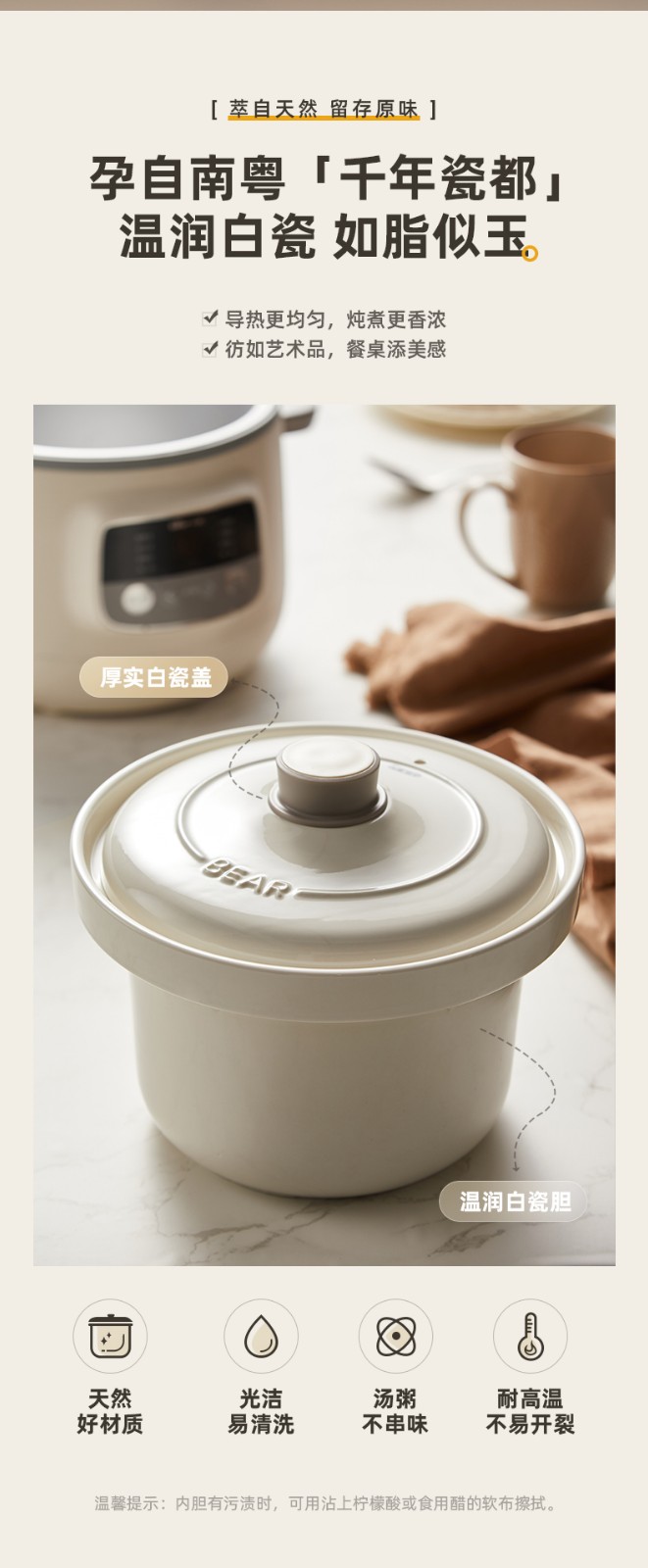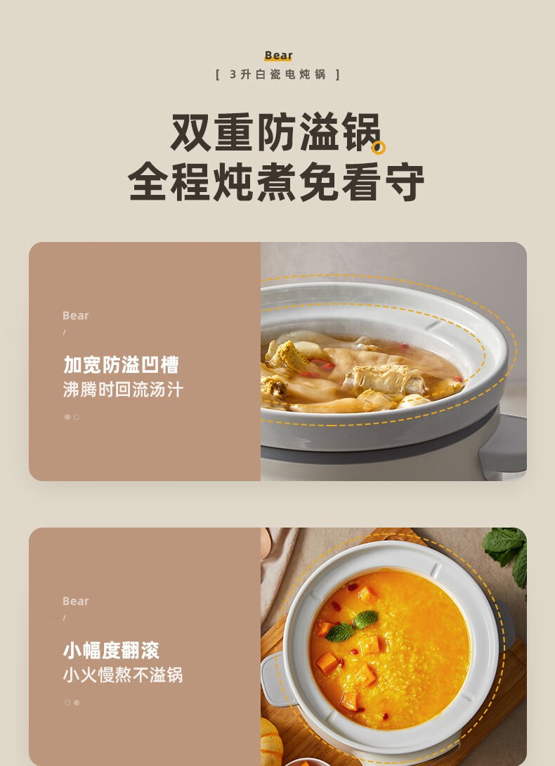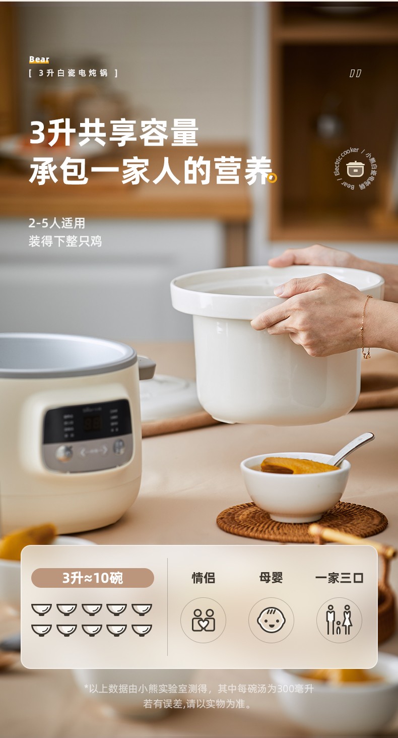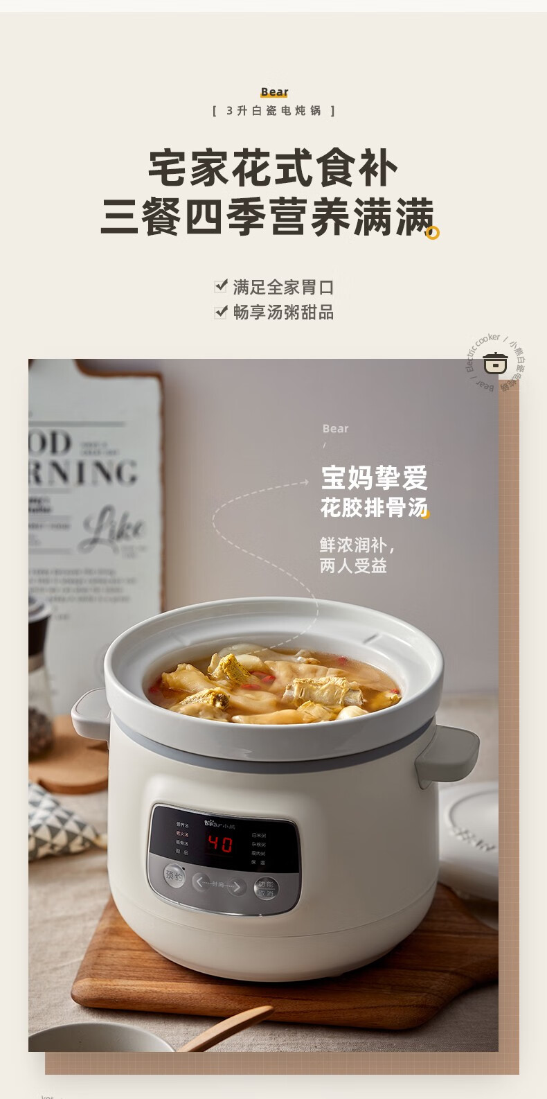 小熊(Bear) 电炖锅电炖盅煲汤锅燕窝炖盅炖汤锅煮粥锅BB煲 3L容量可预约多功能 白瓷内胆DDG-D30H5 自营