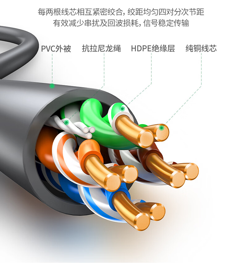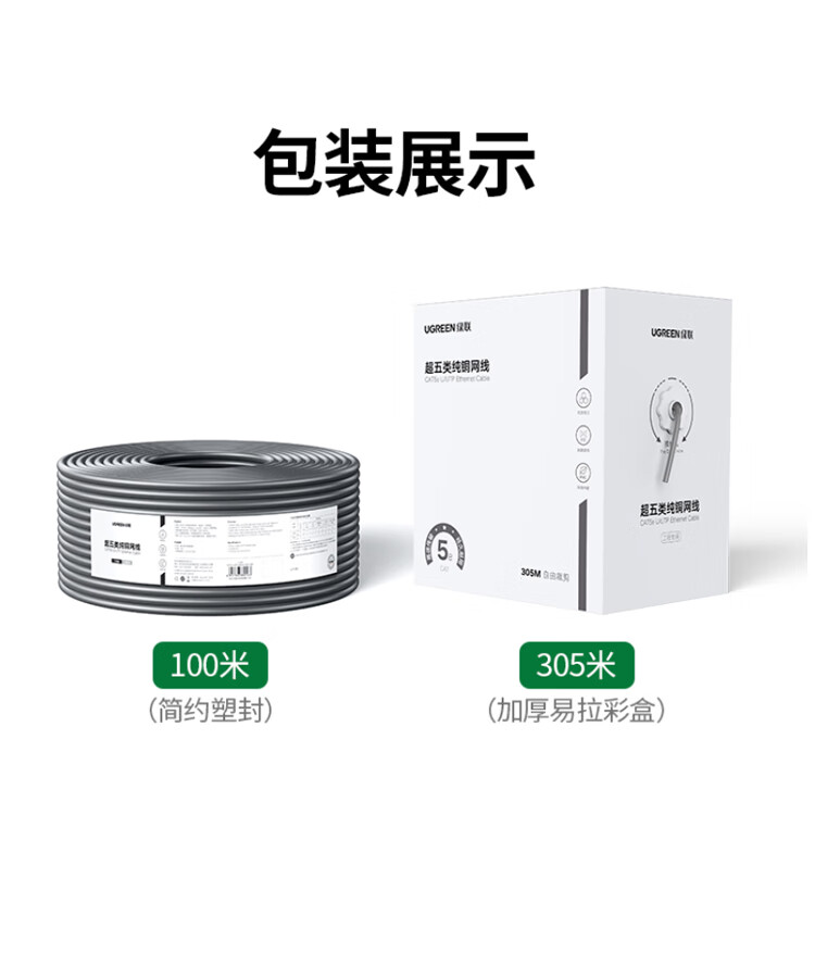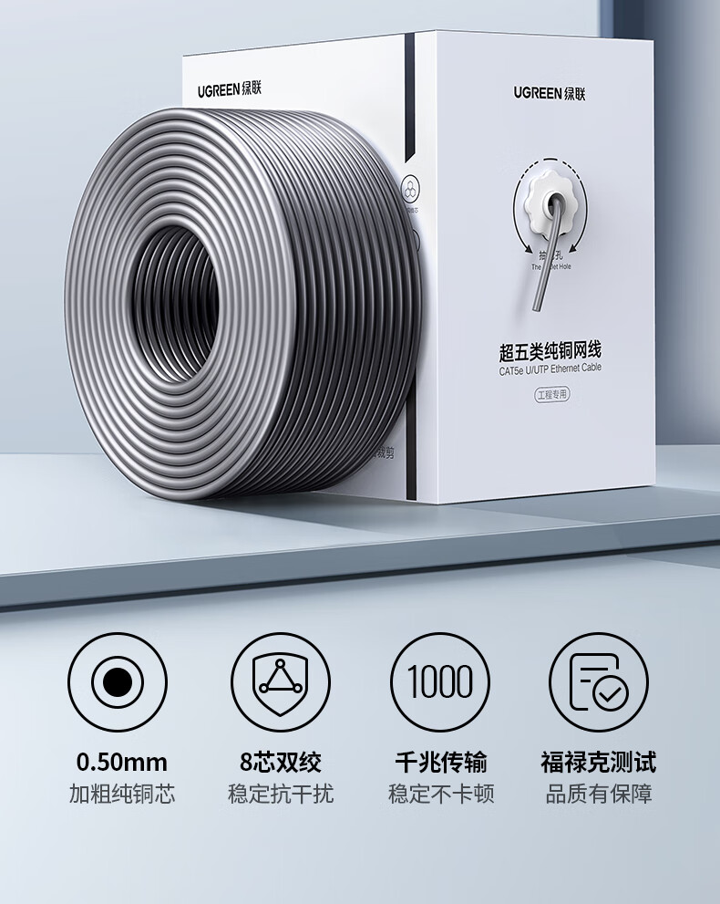 绿联(UGREEN)灰色超五类网线100米【0.50mm纯铜线芯】千兆双绞箱线家装网络布线监控专用 NW108/11253 自营