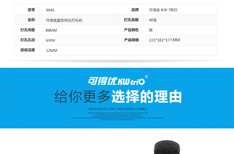 【办公推荐】可得优(KW-triO)9945办公重型省力两孔打孔器大型加厚双孔打孔机圆孔可打40页 可打40页 自营