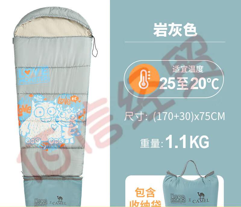 骆驼(CAMEL) 【小怪兽阿蒙】骆驼户外睡袋大人露营加厚四季通用学生午休 1J32255431,岩灰1.1kg 自营