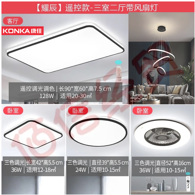 康佳(KONKA)LED客厅灯北欧简约大气卧室吸顶灯 三室二厅(带风扇) 自营