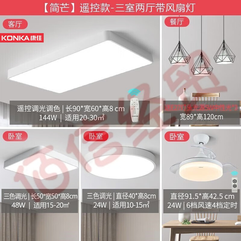 康佳(KONKA)吸顶灯卧室灯客厅灯书房餐厅分区调光调色灯具灯 【简芒】三室二厅(带风扇) 自营