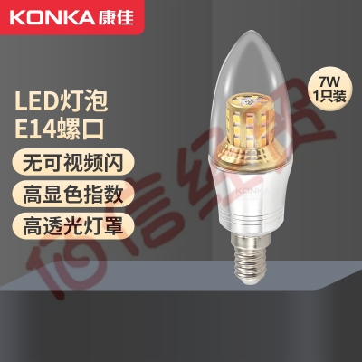 康佳(KONKA)LED灯泡尖泡双色可选客厅灯壁灯水晶灯吊灯家用替换灯 E14-KQP6044-7DD/7W6500K 自营