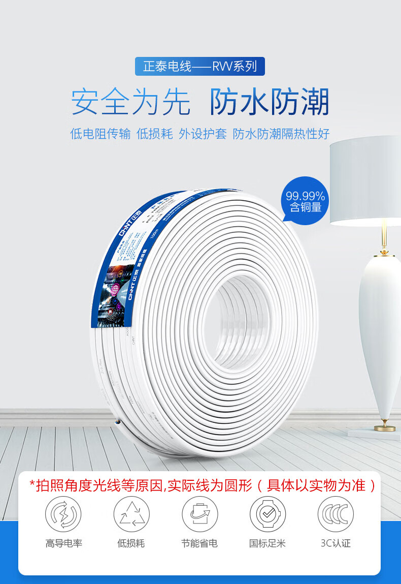正泰(CHNT)电线三芯护套线软线RVV铜芯国标铜线RVV白色3芯*4平方(100米) 自营
