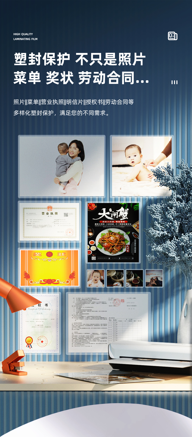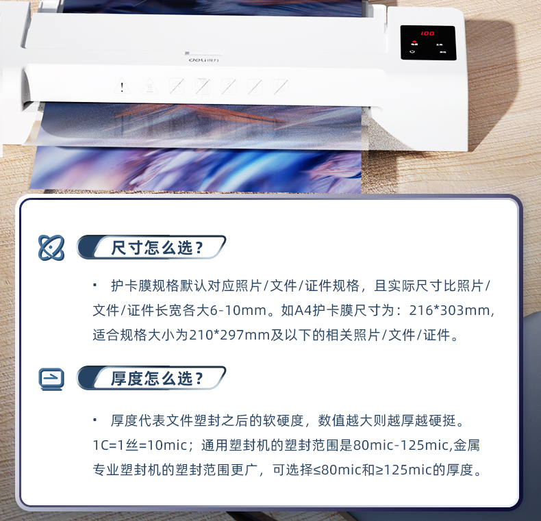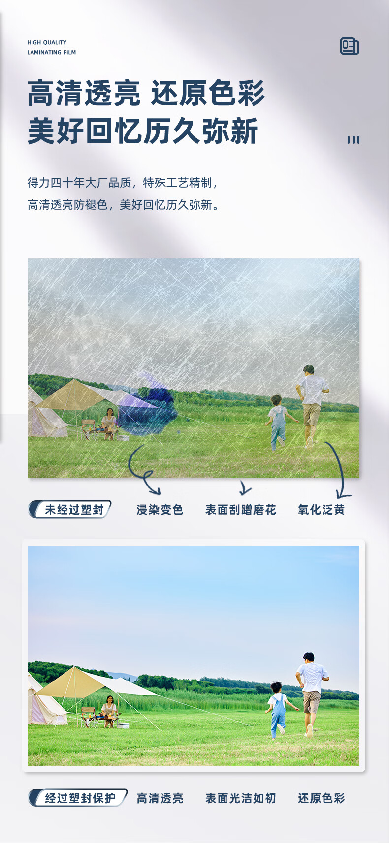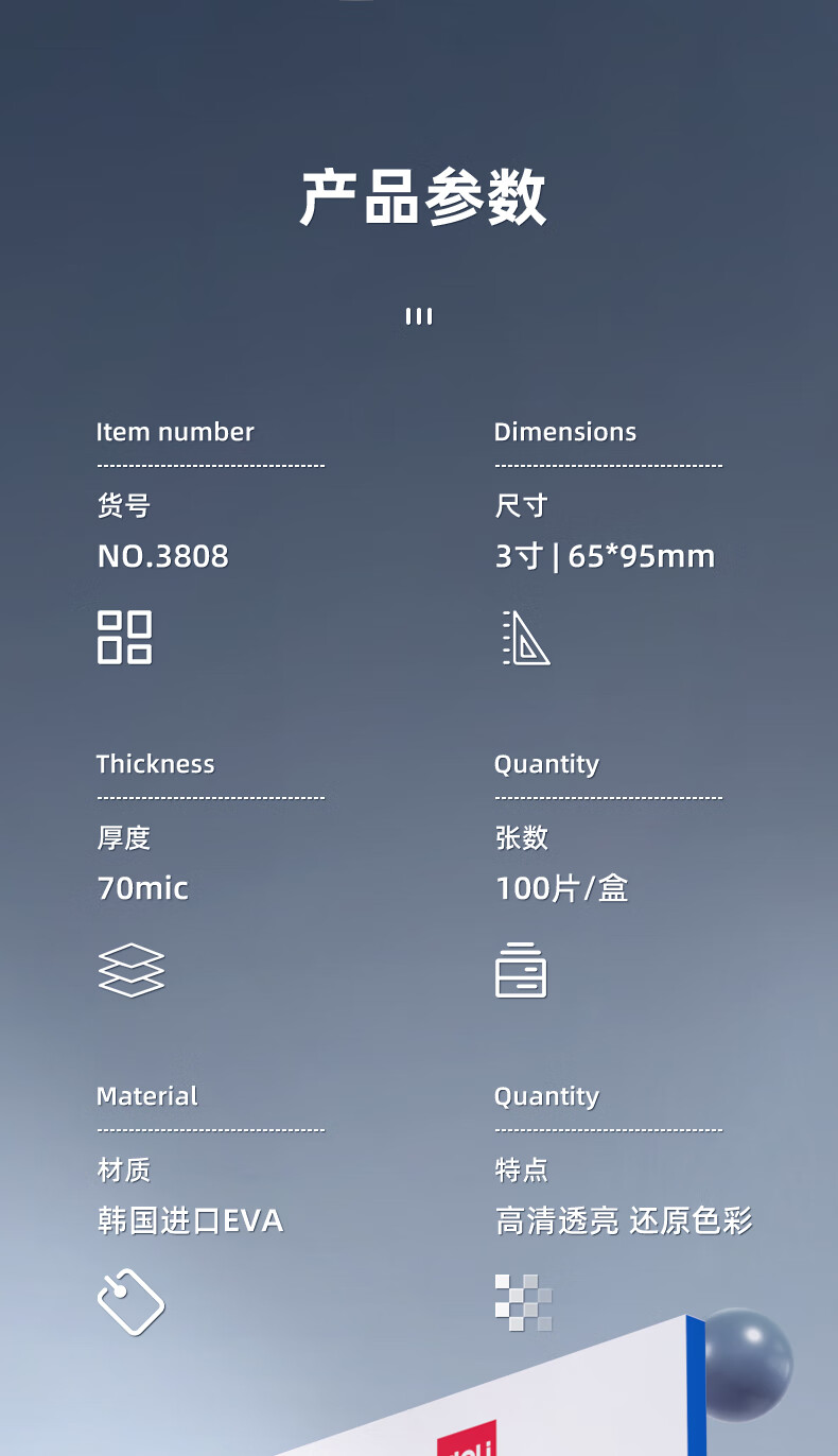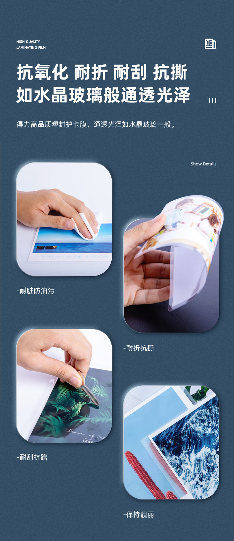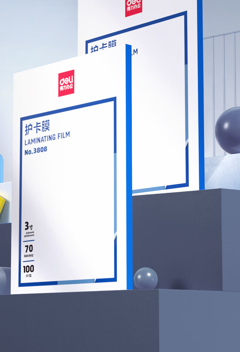 得力(deli)3808过塑机塑封机膜过塑膜优质专用护卡膜/塑封膜65*95mm70mic3寸100张/包 自营