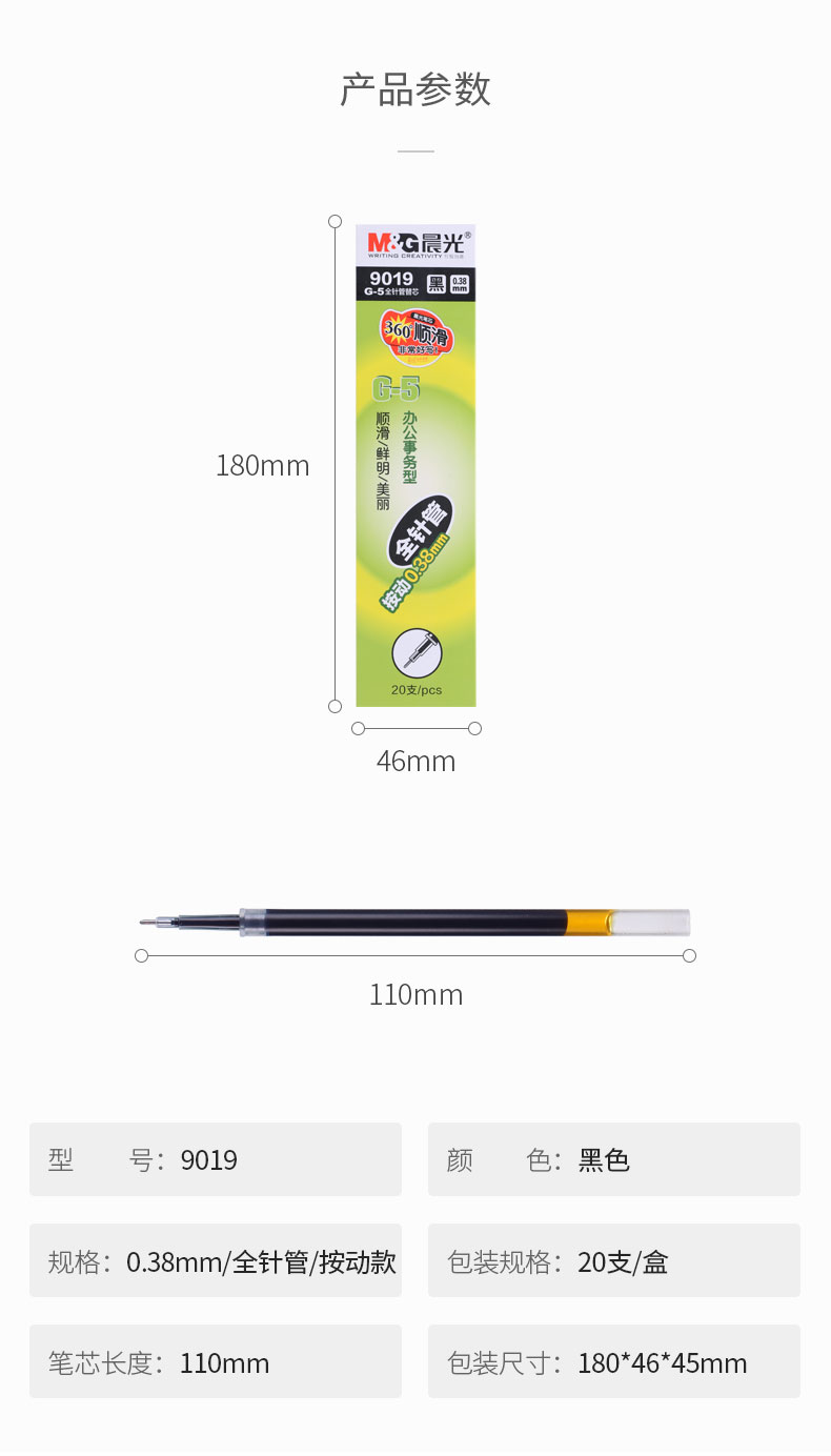 ■晨光0.38mm黑色中性笔替芯-- G-5全针管系列水笔芯 20支/盒9019A 自营