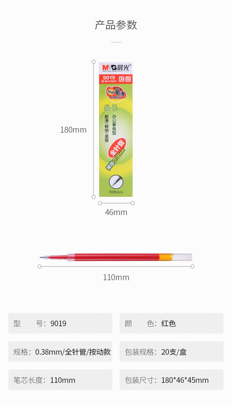 ■晨光0.38mm红色中性笔替芯-- G-5全针管系列水笔芯 20支/盒9019C 自营