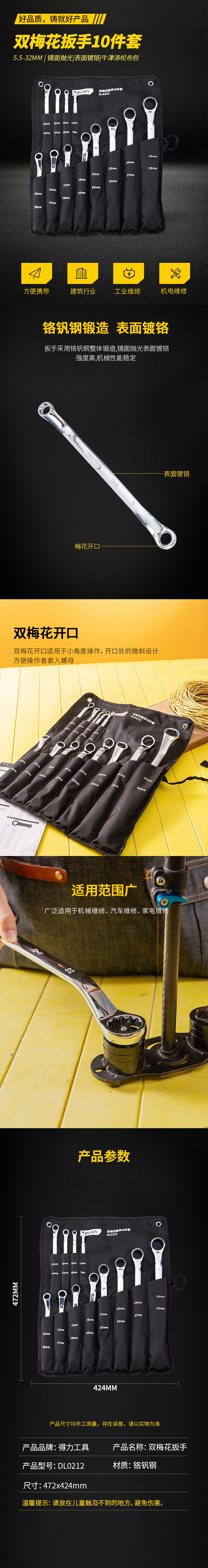 得力(deli) DL0212 _镜面双梅花扳手套装梅花扳手12件套5.5-32mm_