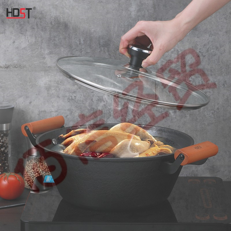 产品特点:  锅体精选生铁为原材料,锅身厚底薄壁设计,物理抗粘,少油烟。木质防滑手柄,防烫,耐用舒适。上盖采用钢化可视玻璃盖,锅盖采用定时温显锅珠。