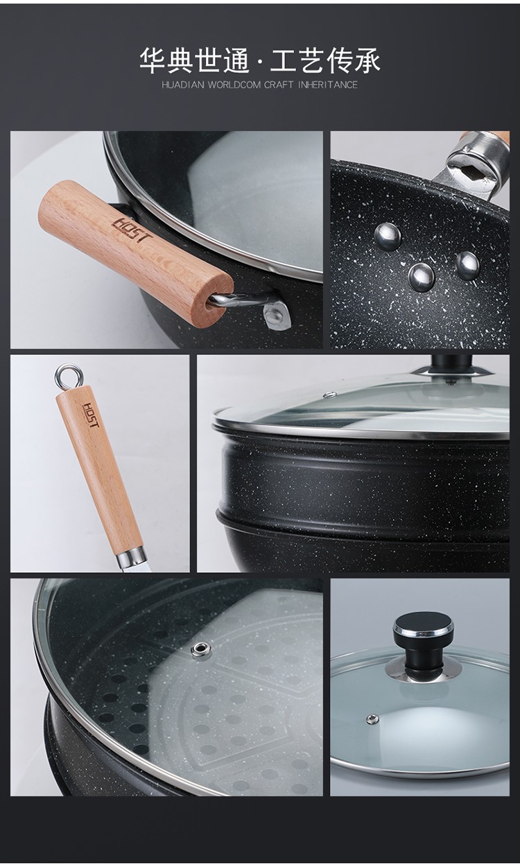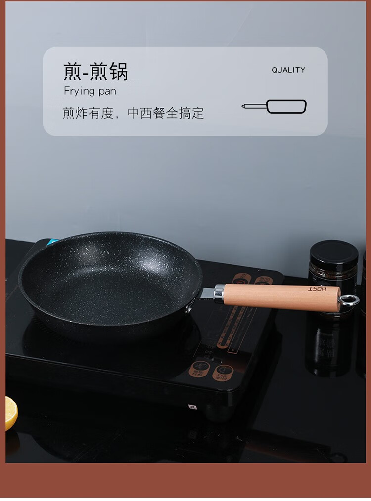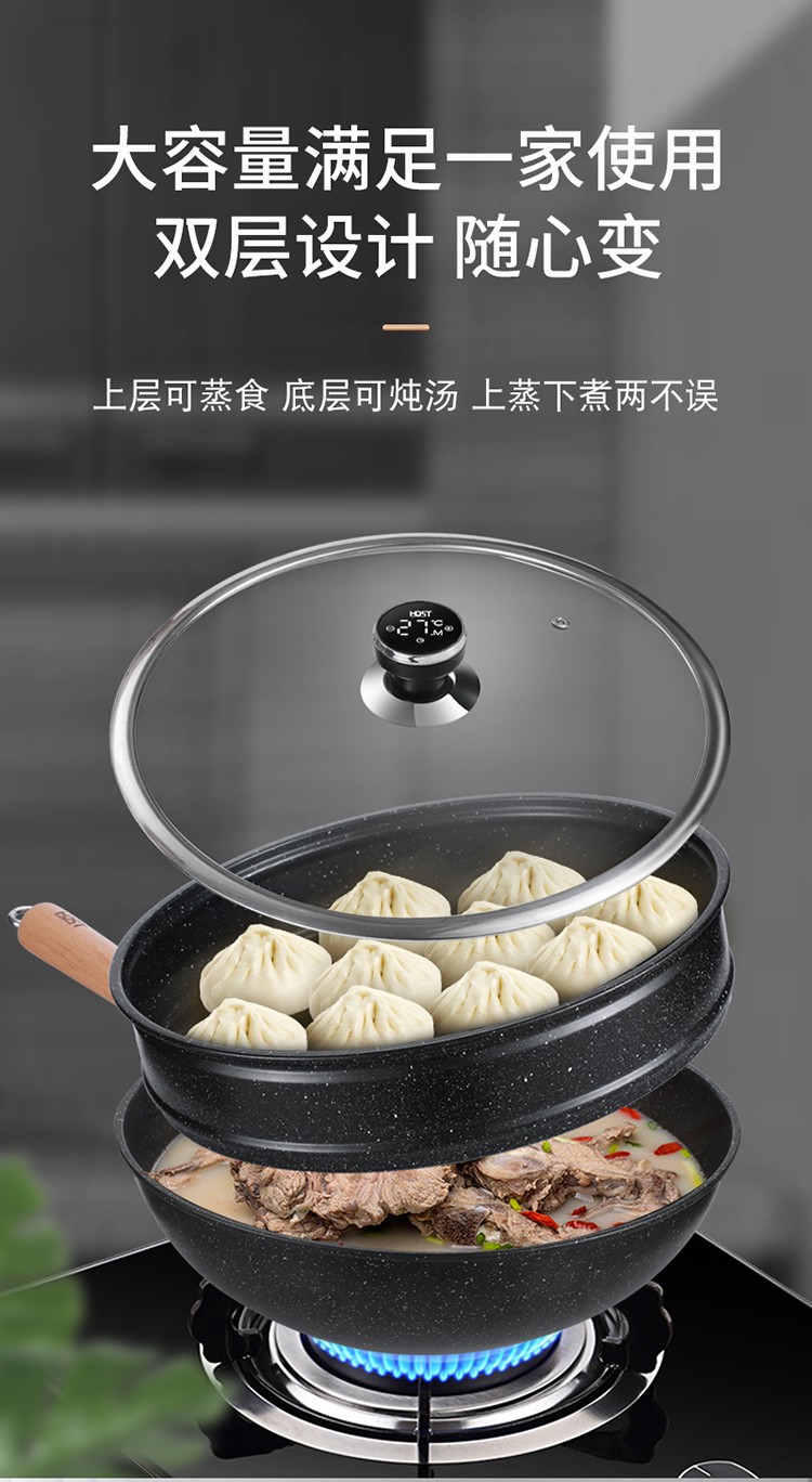 产品特点: 锅体选用健康麦饭石不粘涂层,锅身厚底薄壁设计,受热均匀,少油烟。木质防滑手柄,防烫,耐用舒适。上盖采用钢化可视玻璃盖,锅盖采用定时温显锅珠。