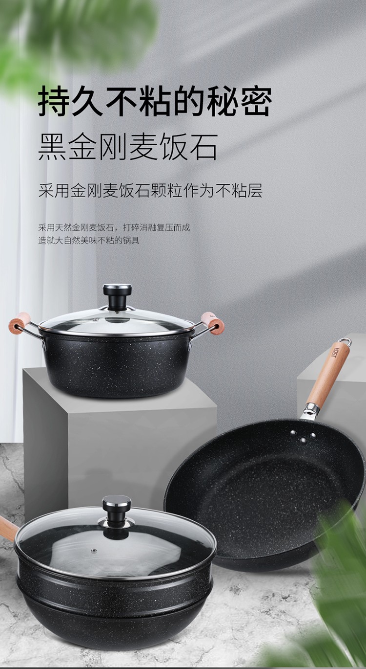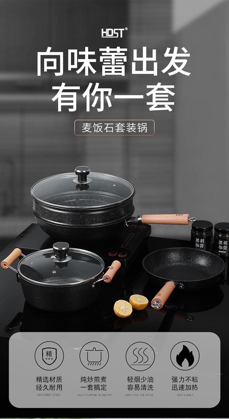 · 商品名称:HDST 御釜 麦饭石不粘锅炒锅煎蛋平底锅家用炒菜锅不沾铁锅煤气电磁炉通用 六件套装 YF-20124