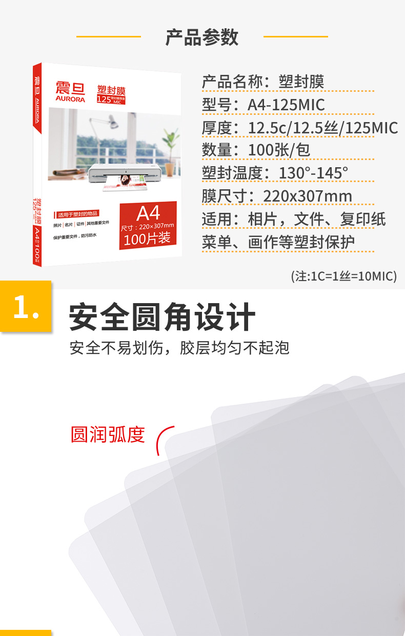 震旦AURORA A4-125MIC透明高清专用护卡膜/塑封膜220x307mm(100张/包) 自营