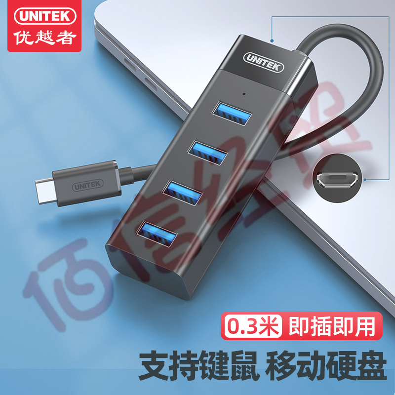 优越者(UNITEK)USB3.0分线器 一拖四 type c 扩展坞 笔记本电脑 多接口HUB集线器0.3米 Y-3098LBK 自营