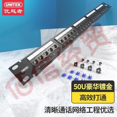 优越者(UNITEK)25口语音电话配线架 50U镀金高端工程模块 1U机架模块式 OT27BK 自营