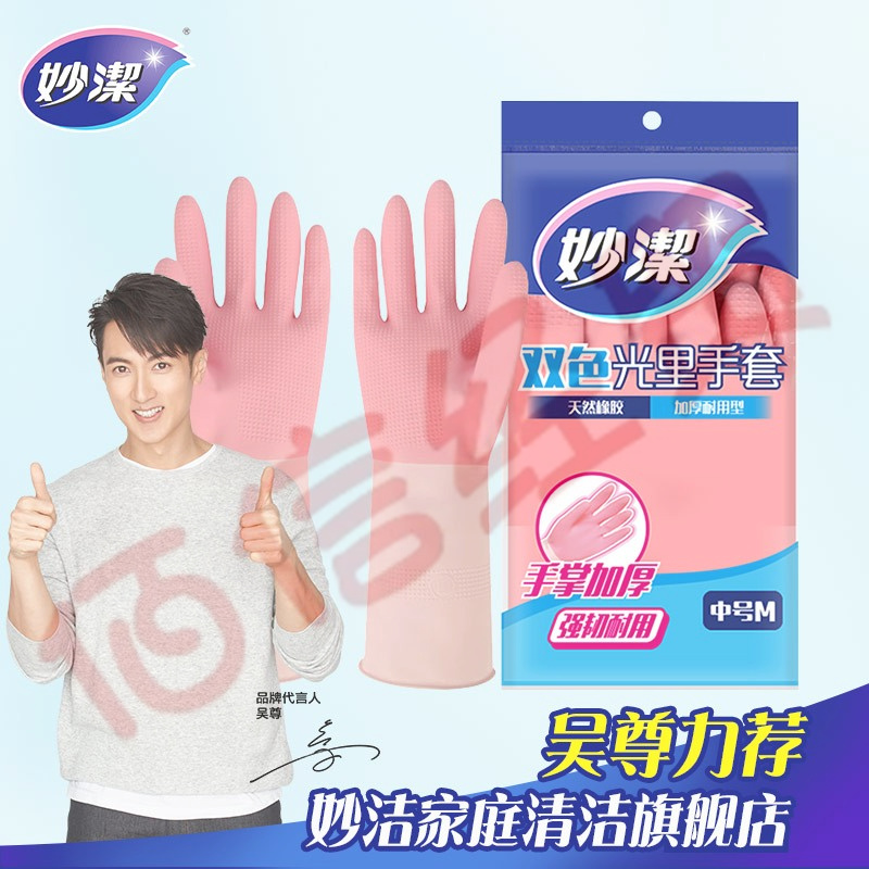 妙洁 双色光里手套加厚手掌清洁家务洗衣橡胶皮防水洗碗手套 中号(10个起售) 自营