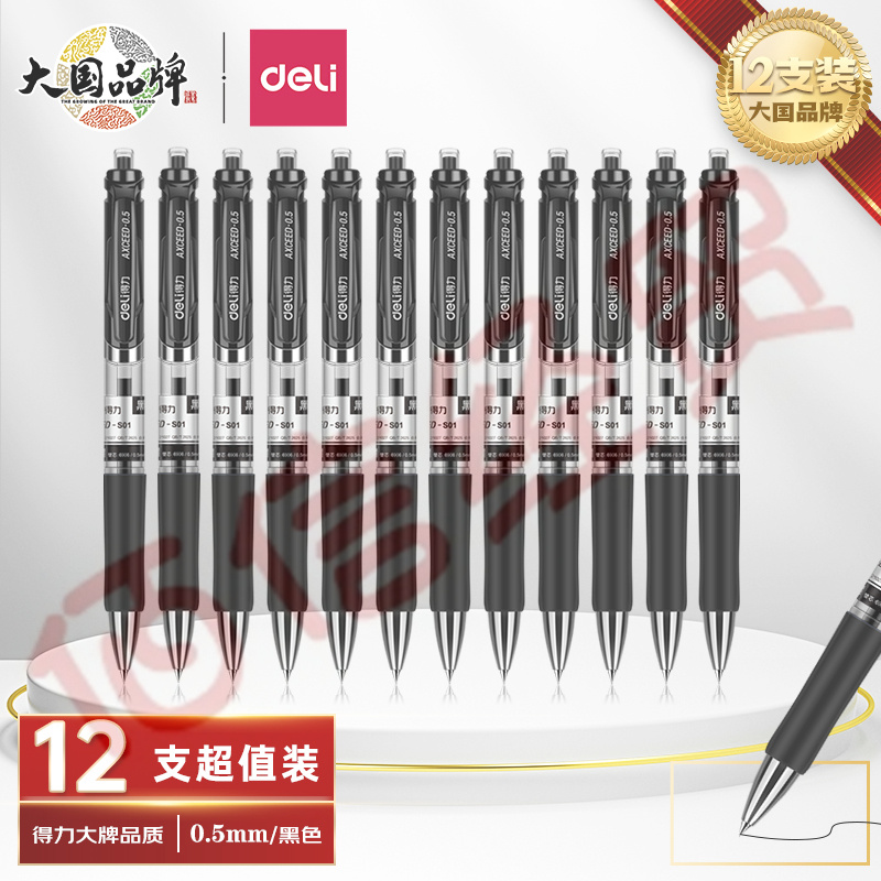 得力(deli)S01中性笔签字笔 0.5mm子弹头经典办公按动笔水笔 黑色 12支/盒 自营