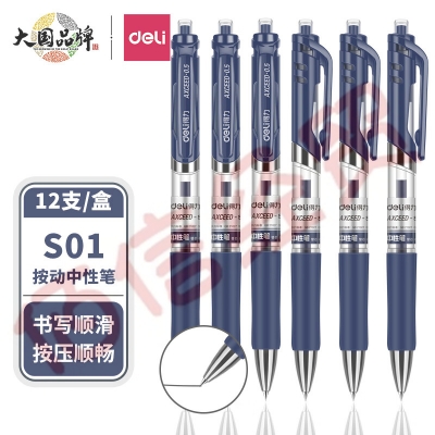 得力(deli)S01中性笔签字笔 0.5mm子弹头经典办公按动笔水笔 墨蓝12支/盒 自营