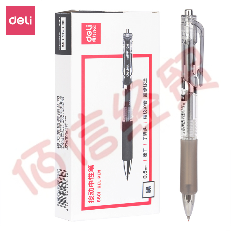 得力(deli)速干中性笔 0.5mm子弹头学生办公签字笔 按动笔水笔 黑色 12支/盒 SG-S801 自营