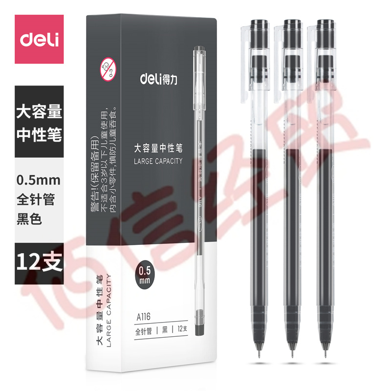 得力(deli)大容量全针管中性笔签字笔 笔芯笔身一体化0.5mm黑色12支/盒DL-A116 学生用品 自营