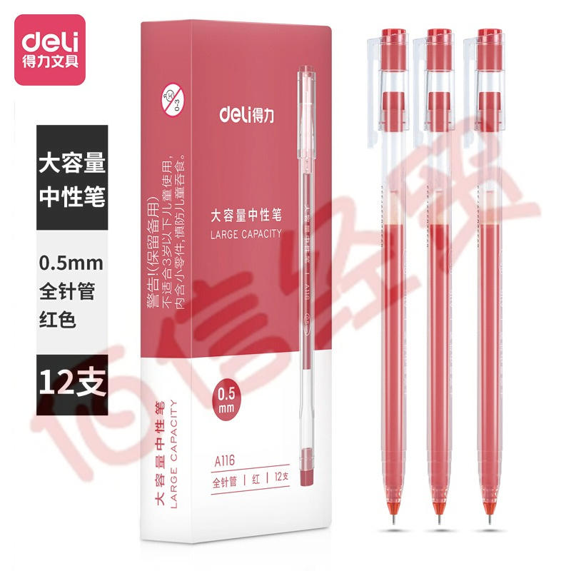 得力(deli)大容量全针管中性笔签字笔 笔芯笔身一体化0.5mm红色12支/盒DL-A116 自营