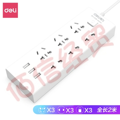 得力(deli)USB智能插座--3USB接口+6孔 总控2米 儿童保护门 18283 自营