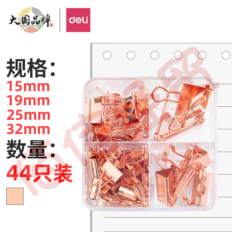 得力(deli)-44只-玫瑰金长尾夹-组合装(32mm*2只+25mm*5只+19mm*12只+15mm*25只) -78205 (每包4盒) 自营