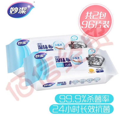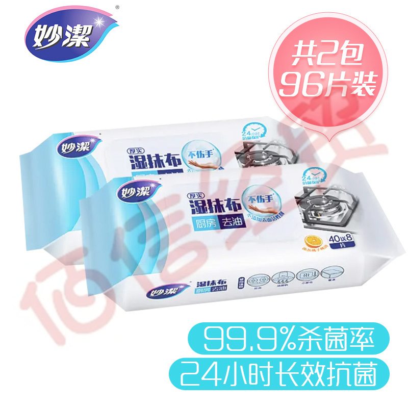 妙洁 抗菌厨房湿纸巾 48片装 湿抹布一次性厨房用纸 杀菌去油污 清洁餐桌灶台料理油烟机电器(5个起售) 自营