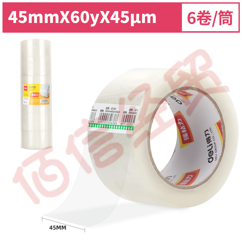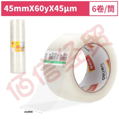 得力(deli) 普透明封箱胶带 快递物流打包胶布 45mm*60y*45um(6卷/筒) 30182 自营