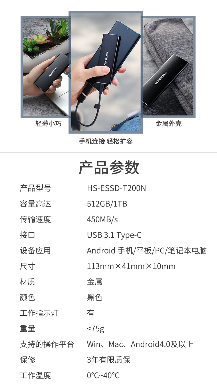 海康威视(HIKVISION)移动硬盘固态 USB3.1Type-C接口办公大手机平板电脑笔记本T200N 2TB 自营