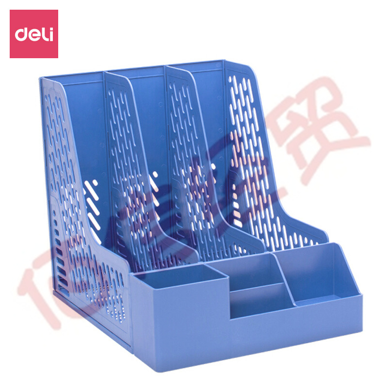 得力(deli)三联带笔筒收纳桌面文件框 多功能镂空文件栏/文件框/资料筐 蓝色 自营