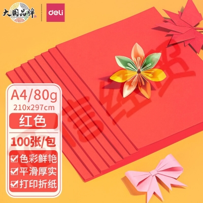 得力(deli)A4 80g大红色复印纸 彩色打印纸 儿童手工折纸剪纸彩纸 非硬卡纸 100张/包 7758 自营