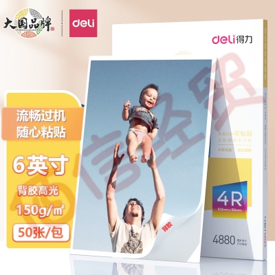 得力(deli)4R(6英寸) 150g带背胶高光面照片纸 可粘贴相片打印纸 50张/盒 11829 自营