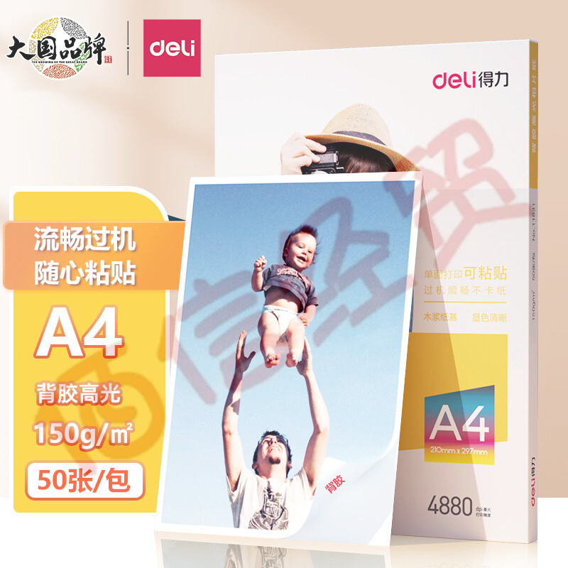 得力(deli)A4 150g带背胶高光面照片纸 可粘贴相片打印纸 50张/盒 11831 自营
