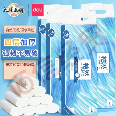 得力(deli)无芯卷纸 加厚4层*40卷 无芯卷式卫生纸 桔然soft系列纸巾 整箱销售(10卷/包共4包) WJ4070-01 自营