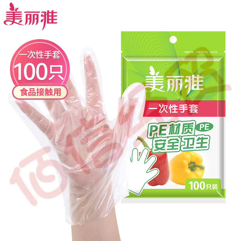 美丽雅 一次性手套100只入 PE材质加厚防漏卫生手套食品用 塑料手套(108包/箱)(10个起售) 自营