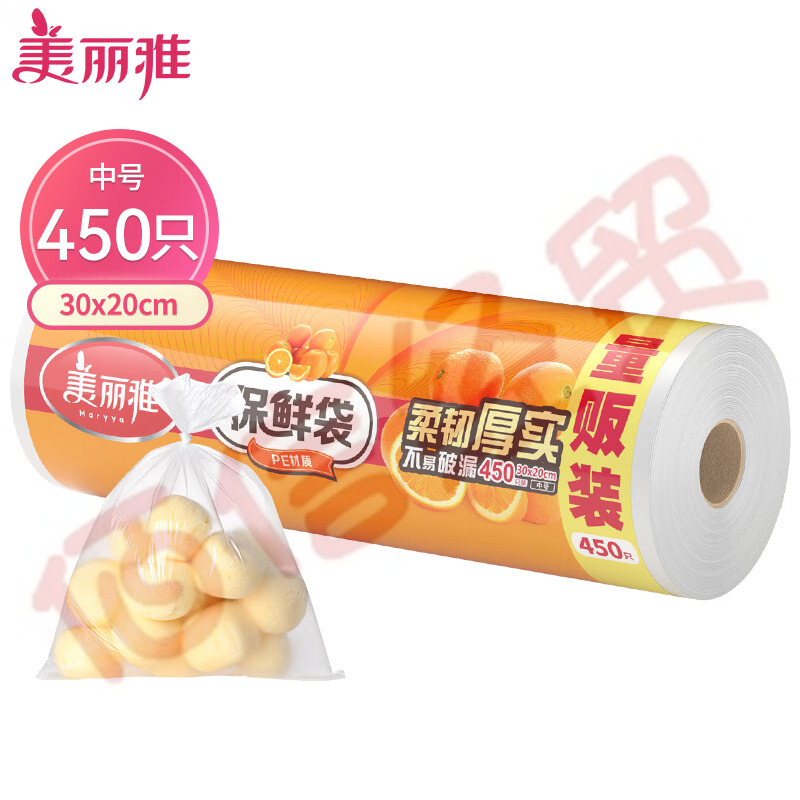 美丽雅 加厚保鲜袋450只中号30*20cm 点断式食品级冰箱分装方便袋家用塑料连卷袋子(12卷/箱)(10个起售) 自营
