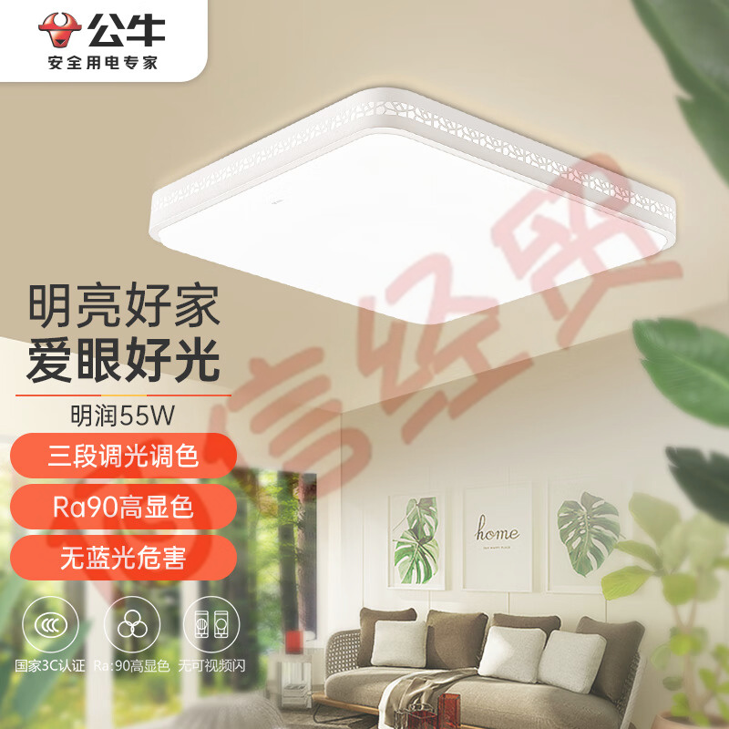 公牛(BULL)吸顶灯明润方形卧室灯简约现代三段调光调色55W 536*536*102.4mm 自营