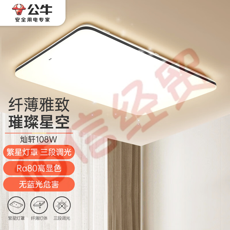 公牛(BULL)LED吸顶灯 北欧现代简约客厅卧室书房餐厅超薄灯具 MX-C108T-BD灿轩长方形客厅灯108W三段调光 自营
