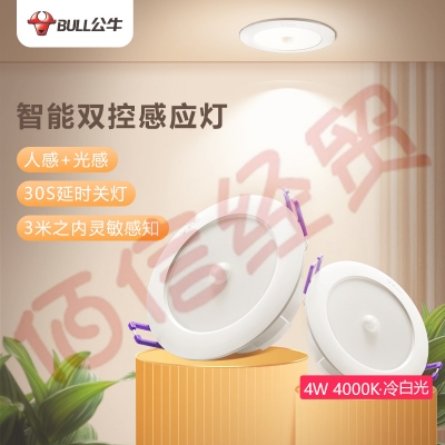 公牛感应筒灯LED智能光控+人体感应嵌入式天花灯走廊过道玄关MT-C004A-CS 4W3寸冷白光4000K/开孔尺寸70-85mm 自营