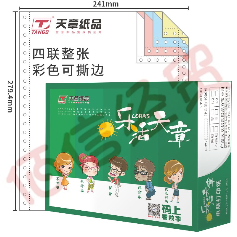 天章(TANGO)乐活天章 针式打印纸 四联二等分撕边电脑打印纸 彩色四联打印纸241-4-1/2S 白红蓝黄 1000页/箱