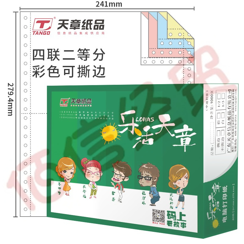 天章(TANGO)乐活天章 针式打印纸 四联二等分撕边电脑打印纸 彩色四联打印纸241-4-1/2S 白红蓝黄 1000页/箱 自营