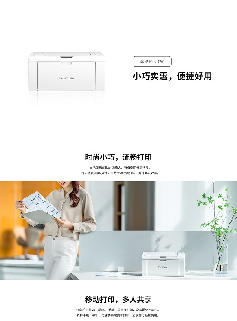 奔图(PANTUM)P2510W黑白激光无线网络WiFi家用打印机(WiFi打印/A4机身) 自营