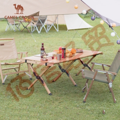 骆驼CAMELCROWN户外露营木质蛋卷桌庭院烧烤野营野餐榉木桌子便携折叠桌椅套餐 A2S31A102,原木色(大号) 自营